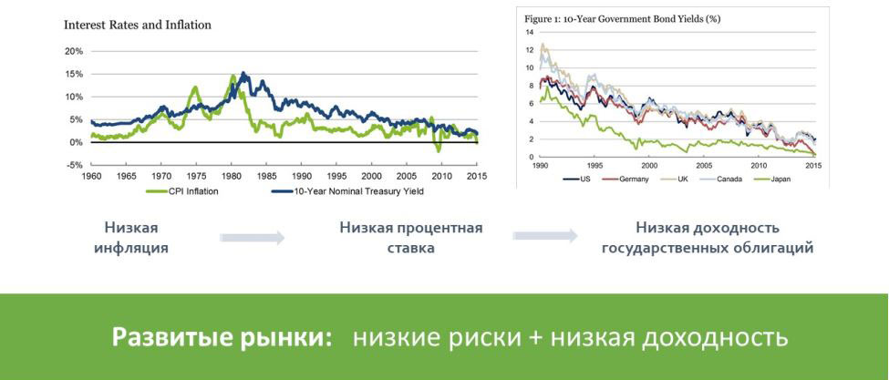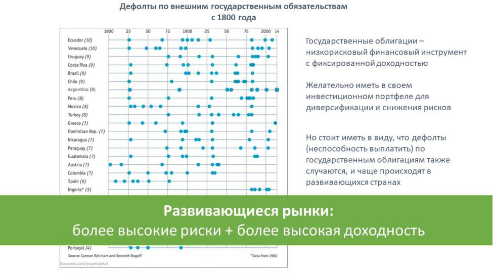 В развивающихся странах более высокая инфляция, и более высокие ключевые ставки центральных банков делают государственные облигации более выгодными по сравнению с облигациями развитых стран. Однако здесь присутствует риск дефолта по государственным обязательствам, как это например, происходило в последние годы в Греции, Венесуэле, Аргентине и некоторых других странах. Под дефолтом подразумевается, что государство не может исполнить своих обязательств и расплатиться с долгами, коими в принципе и являются облигации. На рынке акций, также, несмотря на более высокие риски по сравнению с развитыми странами, доходность здесь может быть выше на несколько процентов.