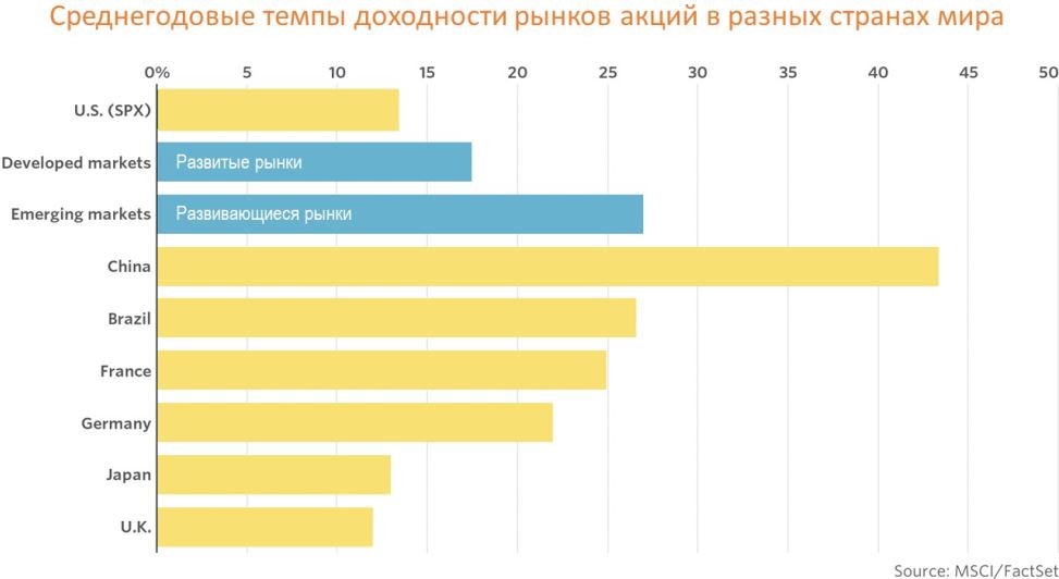 Что касается рынка акций в развитых странах, то в связи с большой конкуренцией, насыщенностью рынка и зачастую высоких налогов, доходность здесь немного меньше, чем в развивающихся странах. Но это конечно не касается высокотехнологичных компаний гигантов, которые работают во всем мире, наподобие Google, Amazon, Apple и т.д.