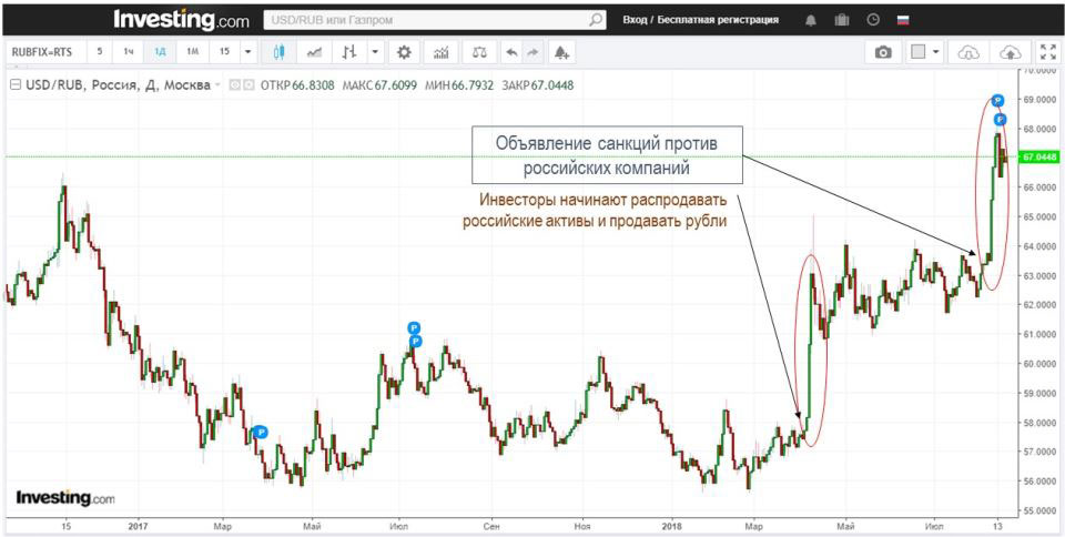 Это очень заметно бывает например каждый раз, когда в отношении России объявляют очередные санкции, и рынок моментально проседает, так же как и российский рубль, который может спокойно в такие моменты терять около 10% за неделю и 25% за полгода.