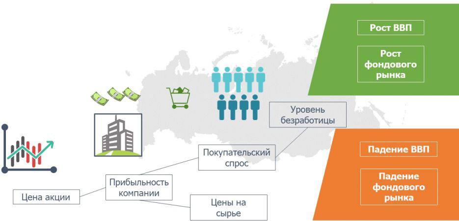 Так вот, цены акций в этой стране будут во многом зависеть от успешности деятельности компаний. А деятельность компаний, в свою очередь, зависит от таких факторов, как спрос на их товары и услуги со стороны населения, уровень безработицы, который влияет на покупательскую способность населения, цены на сырьевые ресурсы, потому что от этого зависят расходы многих компаний, и так далее.