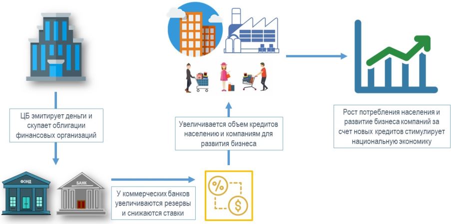 Количественное смягчение, на английском языке более известное как Quantitative easing или сокращенно QE – это монетарная политика центрального банка той или иной страны с целью стимулирования экономики. Количественное смягчение заключается в том, что центральный банк страны на протяжении определенного периода времени проводит дополнительную эмиссию, то есть выпуск денег. За счет этих денежных средств начинается покупка ценных бумаг коммерческих компаний, как правило, покупаются облигации банков. Благодаря этому, снижаются процентные ставки, за счет чего увеличивается объем потребления в стране, потому что кредиты становятся более дешевыми как для населения, так и для компаний. Компании начинают брать кредиты, чтобы развивать производство, а население берет кредиты и начинает тратить больше на покупку жилья, автомобилей и потребительских товаров. Все это способствует росту национальной экономики.