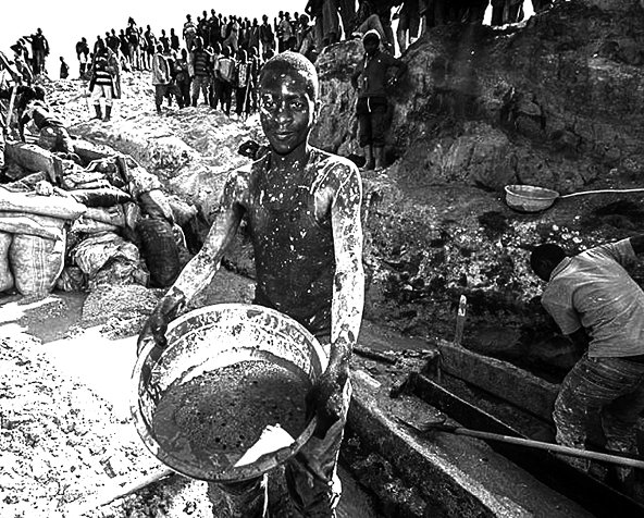 Склон становился все круче. Земля под ногами уступала место песчаным дюнам. Наконец показался пик из зазубренной породы – гигантская окаменевшая губка из нор, которые шахтеры вырыли вручную. Около двух тысяч шахтеров, все в веллингтоновских ботинках, многие с лопатами и кирками, копошились в ямах и траншеях, некоторые погружались в землю на 15 метров, имея лишь примитивные подпорки, чтобы края не осыпались и не похоронили их заживо. Некоторые выглядели явно моложе восемнадцати лет. Один из них был явно озадачен белокожим посетителем, чьи волосы были длиннее стандартной конголезской стрижки.