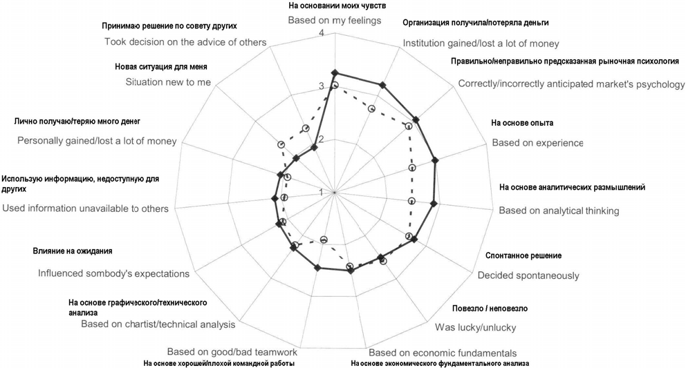 Систематический анализ различий показывает, что «командная работа» оценивалась как значительно более важная в лучших торговых решениях. Эти данные усиливают важность социального и группового факторов в успешной биржевой торговле. Более того, анализ также показал, что в худших торговых решениях, «Я принял решение по совету других» и «Ситуация была для меня новой» такие факторы занимали значительно более важное место. Эти данные могут быть объяснены как тенденция к самообслуживанию со стороны трейдеров. Атрибуции – это психологические суждения о причинах поведения или событий. В то время как кто-то, кто формирует внутреннюю атрибуцию, считает ответственным действующее лицо, те, кто формирует внешнюю атрибуцию, думают, что ответственность за определенное поведение или событие несут ситуационные причины. Поскольку как посторонний совет, так и новизна рыночной ситуации приписывают плохие торговые решения внешним причинам, рейтинги трейдеров, возможно, выражают самоусиливающееся предубеждение, которое искажает их объяснения успеха и провала4.
