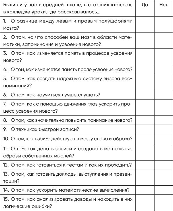 Однако, прежде чем мы приступим к совершенствованию таких функций мозга, как логика, умение обращаться с цифрами, анализ и воображение, я попрошу вас припомнить, рассказывали ли вам учителя о том, как работает ваш мозг. Ниже приведены вопросы; ответьте на них, поставив рядом с каждым галочку в колонке «да» или «нет». Ваша задача – зафиксировать свои ответы, чтобы впоследствии, по завершении этой программы, вернуться к ним и воочию увидеть, как сильно вы продвинулись в своем развитии.