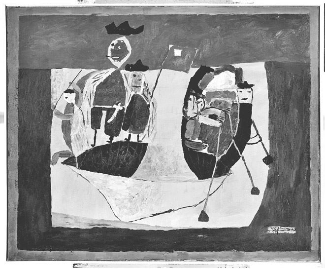 А кто с ходу назовет имя американца, автора картины «Вашингтон переправляется через Делавэр I» (ок. 1951)? Она принадлежит кисти художника, который позже создал несколько легко узнаваемых, культовых произведений ХХ века, совершенно не похожих на эту посткубистскую, квазисюрреалистическую картину, написанную явно под влиянием Жоана Миро.