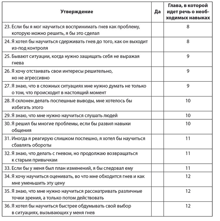 Этот опросник не охватывает все возможные характеристики гнева. Но он соотносится с информацией, которую вы найдете в этой книге, и позволит вам определить области, на которых следует сосредоточиться.