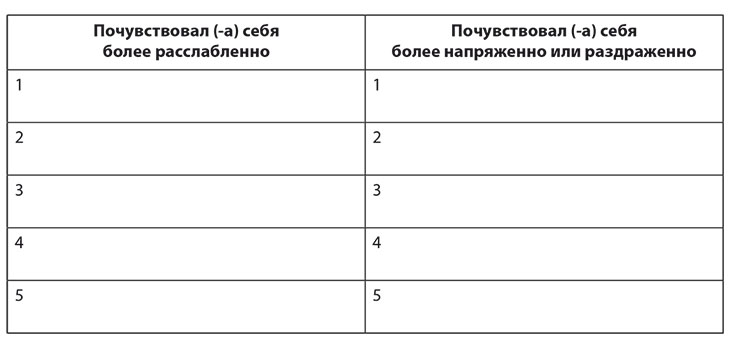 Когда в следующий раз вы почувствуете напряжение или раздражение, откиньтесь назад примерно на 30 градусов и попробуйте посидеть так в течение пяти минут. Почувствовали ли вы себя более расслабленно по истечении этого времени? Протестируйте эту технику пять раз и запишите свои наблюдения в таблице ниже. Каждый раз отмечайте столбец, который лучше всего описывает полученные вами результаты.