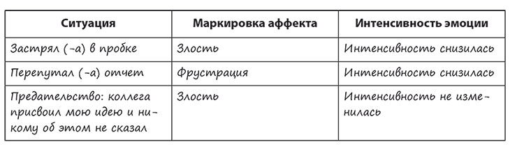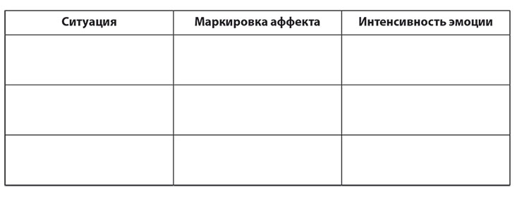 В следующем примере показано, как провести эксперимент. В первом столбце описаны ситуации, активирующие эмоции. Второй отведен под обозначение аффекта, а третий – для записи интенсивности эмоции после того, как вы ее назвали. Для этого эксперимента вы можете использовать либо слово «гнев», либо другое слово, связанное с гневом, которое лучше всего подходит для описания того, что вы испытываете, – например, «раздражен», «расстроен» или «фрустрирован».