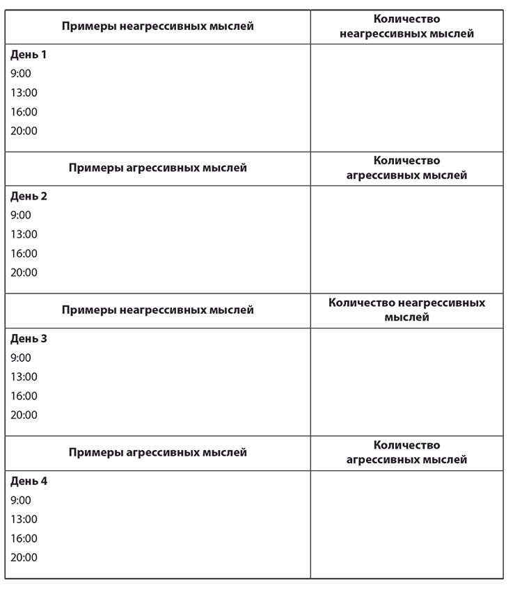 Если у вас возникают агрессивные мысли в то время, когда вы записываете неагрессивные мысли, и наоборот, подсчитайте и запишите их в таблице «Особые мысли». Однако агрессивные мысли не обязаны следовать временному графику. Важно знать, о чем вы думаете, и иметь приблизительное представление о том, как часто у вас возникают неагрессивные и агрессивные мысли.