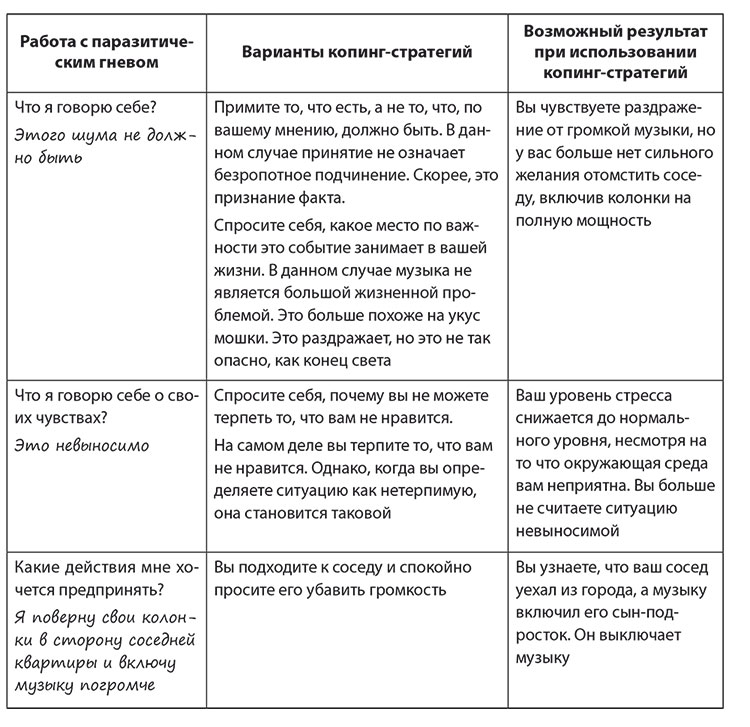 В следующей таблице вы можете на примере соседа-меломана увидеть, как действует эмпирический подход. Первая колонка – это работа с паразитическим гневом, во второй описаны варианты копинг-стратегий (стратегий преодоления трудностей), а в третьей – возможный результат.