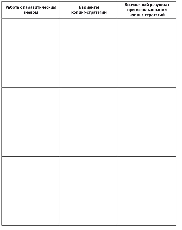 Настала ваша очередь экспериментировать. Опишите пример работы со своим собственным паразитическим гневом. Протестируйте копинг-стратегии. Запишите, что у вас получилось.