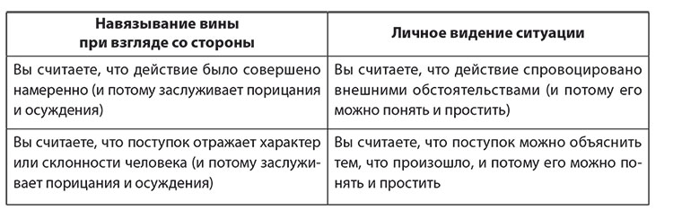 Ошибки атрибуции гнева обычно связаны с обобщением характера, навязыванием вины и оправданием наказания. Посмотрев на ситуацию с другой стороны, вы можете посочувствовать недостаткам и ошибкам другого человека в данной ситуации и помочь себе избавиться от привычки навязывать чувство вины. Эмпатия, или понимание ситуации, в которой оказался другой человек (вы ставите себя на место другого), несовместима с мышлением, основанным на навязывании вины.