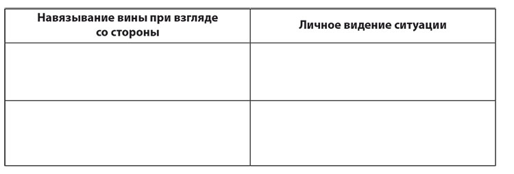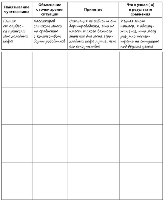 В приведенной ниже таблице сравните взгляды с точки зрения навязывания чувства вины, объяснения ситуации и принятия. Подумайте, чему вы научились. Первая строка – это пример. Ситуация заключается в следующем: стюардесса принесла вам теплый кофе, а вы хотели горячий. Заполните оставшиеся строки собственными примерами.