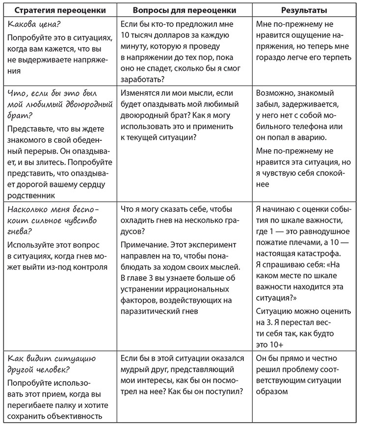 Если нет первичной оценки, которая и провоцирует появление чувства гнева, то нет и необходимости в повторной оценке. Попробовав различные способы переоценки, вы заметите, что некоторые из них подходят вам лучше, чем другие.