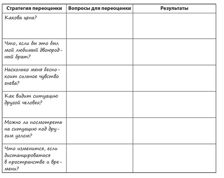 Вы можете развить навыки переоценки с помощью метода управляемой переоценки. В левой колонке таблицы, приведенной ниже, вы найдете вопросы и примеры ситуаций, в которых их следует себе задать. В средней колонке показано, как иначе взглянуть на ситуацию. Колонка справа предназначена для описания результатов использования метода.