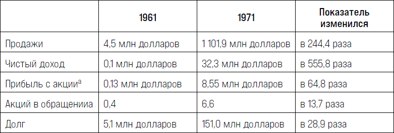 Насколько такой подход оправдал себя, можно увидеть в таблице 2–1. За первые десять лет на бирже Teledyne увеличила прибыль со своих акций в немыслимые шестьдесят четыре раза. Число выпущенных акций тем временем выросло не более чем в четырнадцать раз, от чего ощутимо выиграли акционеры.