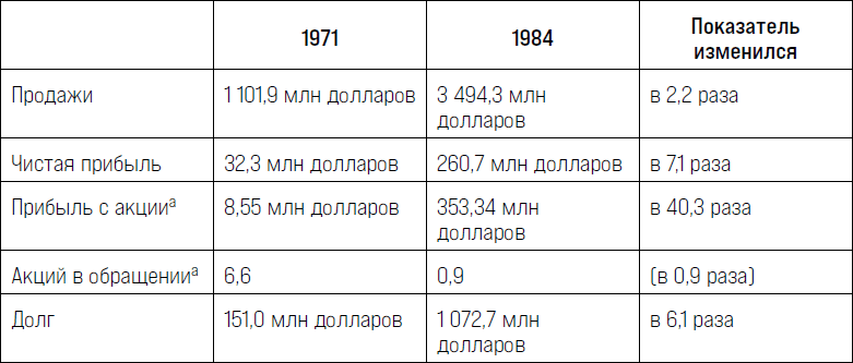 Таблица 2–2 показывает динамику произошедшего. С 1971 по 1984 год Синглтон выкупал огромные доли Teledyne при низком соотношении «цена—прибыль», в то время как выручка и чистая прибыль компании неизменно росли. Благодаря этому доходность акции выросла до немыслимых сорока процентов.