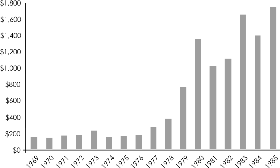 Совсем как обратный выкуп акций, указанная мера позволила Синглтону обеспечить невероятную доходность – только на этот раз портфеля акций. Предполагаемая доходность указана на Рисунке 2–1: как можно увидеть, с 1975 по 1985 год (то есть вплоть до начала ликвидации Teledyne) учетная стоимость страховых дочерних предприятий выросла раз в восемь.