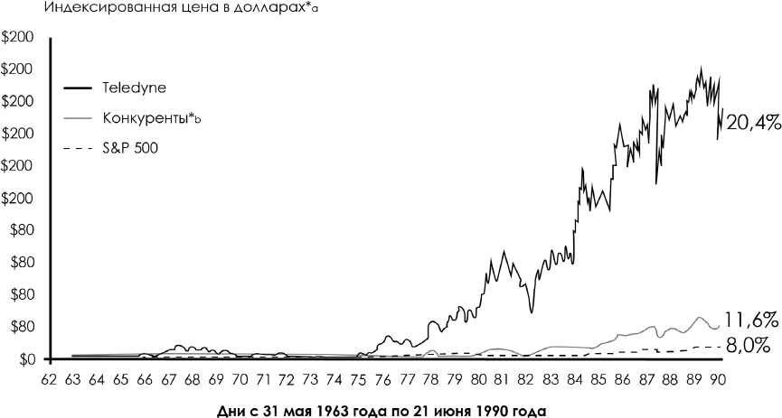 Так у Синглтона образовался внушительный список заслуг, в которых он превзошел и соперников, и рынок. С 1963 года (первого года, по которому удалось добыть надежные данные по акциям) по 1990 (то есть до года, когда Синглтон покинул должность председателя) Синглтон обеспечивал своим акционерам (в том числе держателям акций выделенных компаний) невероятную совокупную годовую доходность, размер которой составлял 20,4 %. Для сравнения, доходность S&P 500 в то же время составляла 8 %; других конгломератов – 11,6 % (см. Рисунок 2–2).