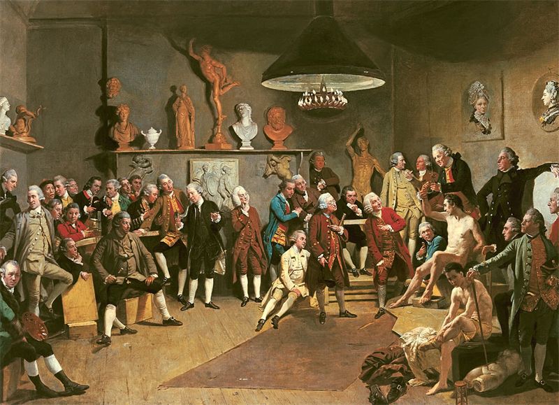 В числе основателей Британской королевской академии художеств в 1768 году были две женщины: художницы Ангелика Кауфман и Мэри Мозер. Обе – дочери иностранцев, обе активно подвизались в группе художников-мужчин, сыгравших ключевую роль в создании Королевской академии, что, несомненно, способствовало их членству. Кауфман, избранную в 1765 году в престижную Академию Святого Луки в Риме, по прибытии в Лондон в 1766 году провозгласили преемницей Ван Дейка. Она была самой известной художницей, связанной с декоративным и романтическим направлением классицизма, и в значительной степени способствовала распространению в Англии эстетических принципов аббата Винкельмана, ее, наряду с шотландцем Гэвином Гамильтоном и американцем Бенджамином Уэстом, считают популяризатором неоклассицизма. Мэри Мозер, чья репутация тогда соперничала с репутацией Кауфман, была дочерью Георга Мозера, швейцарского эмальера, первого хранителя Королевской академии. Модная художница, которой покровительствовала королева Шарлотта, она была одной из двух художников-флористов, принятых в Академию. Однако на групповом портрете кисти Иоганна Цоффани «Академики Королевской академии» (1772), посвященном недавнему основанию Королевской академии, Кауфман и Мозер нет среди художников, произвольно расположившихся вокруг голых натурщиков-мужчин. В беседе об искусстве, которую ведут мужчины, двум женщинам-академикам не нашлось места. Женщинам запрещалось изучать обнаженную натуру, что было основой академического обучения и изображения с XVI по XIX век. После Кауфман и Мозер ни одна женщина не допускалась в Британскую королевскую академию, пока в 1922 году Энни Луиза Суиннертон не стала ее ассоциированным членом, а в 1936 году Лору Найт не избрали полноправным членом.