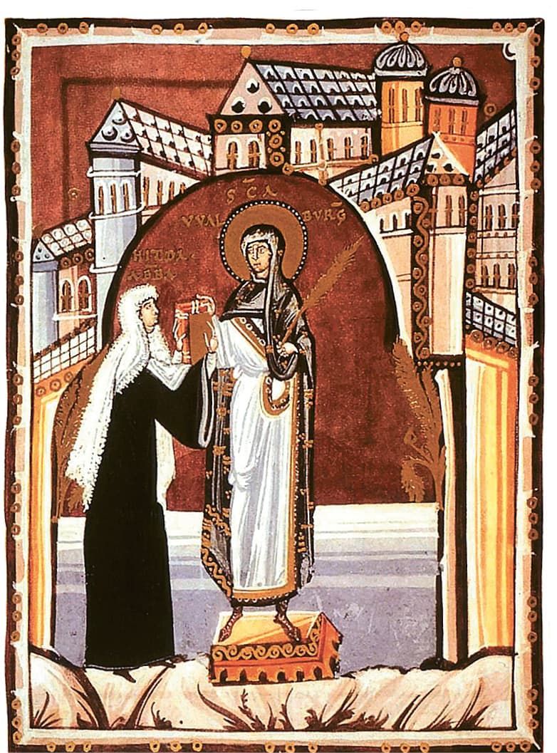 [18] Евангелие аббатисы Хитды, на которой изображена аббатиса, предлагающая свое Евангелие покровительнице монастыря святой Вальбурге. Ок. 1020
