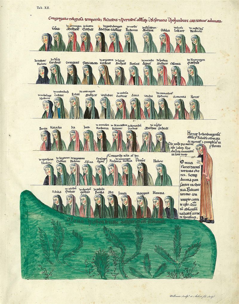 В 1167 году Герраду избрали настоятельницей Гогенбургского монастыря близ Страсбурга. «Сад утех» – массивный фолиант из 324 листов пергамента, в котором содержится 636 миниатюр, вероятно, выполненных в профессиональной мастерской в Страсбурге вскоре после ее смерти в 1195 году. Это одновременно антология и религиозная энциклопедия, она включает в себя около 1200 текстов различных авторов, а также несколько стихотворений, написанных, судя по всему, Геррадой. Кроме литературной и редакторской работы она почти наверняка руководила работой иллюстраторов и, возможно, участвовала в создании эскизов. На протяжении всего Средневековья рукопись оставалась в Гогенбургском монастыре. К сожалению, во время бомбардировки Страсбурга в 1870 году оригинал был уничтожен, до нас дошло только небольшое количество иллюстраций, воспроизведенных на гравюрах XIX века, и несколько фрагментов миниатюр, позднее приобретенных Британским музеем.
