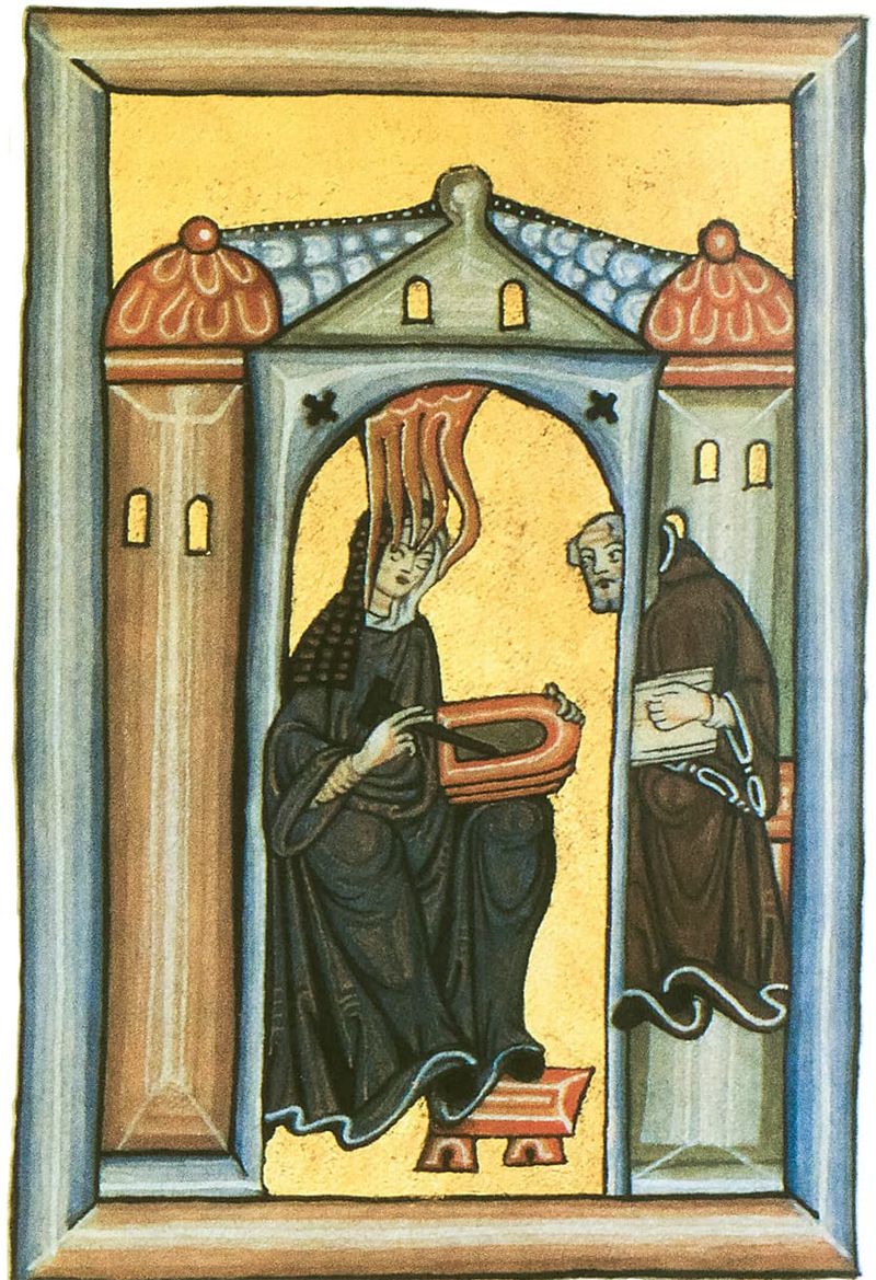 Знаменитая монахиня-созерцательница и политик, активно переписывавшаяся с Генрихом II Английским, королевой Элеонорой, греческим императором и императрицей, Бернардом Клервоским и многими другими, Хильдегарда родилась в 1098 году в зажиточной семье в рейнской деревне. Ее отец был рыцарем при дворе графа Шпонхайма. Детские видения Хильдегарды – «огнистый свет» и кружащие звезды – возможно, повлияли на решение семьи отдать ее в возрасте семи или восьми лет послушницей в монастырь Дизибоденберг. К тому времени в тамошнем четырехсотлетнем бенедиктинском аббатстве как раз появилась женская община, руководимая Юттой, сестрой графа Шпонхайма, она-то и взялась за воспитание Хильдегарды, научив ее латыни и музыке, приобщив к чтению Священного писания. В 1117 году Хильдегарда приняла постриг монахини-бенедиктинки, а в 1136 году была избрана настоятельницей.