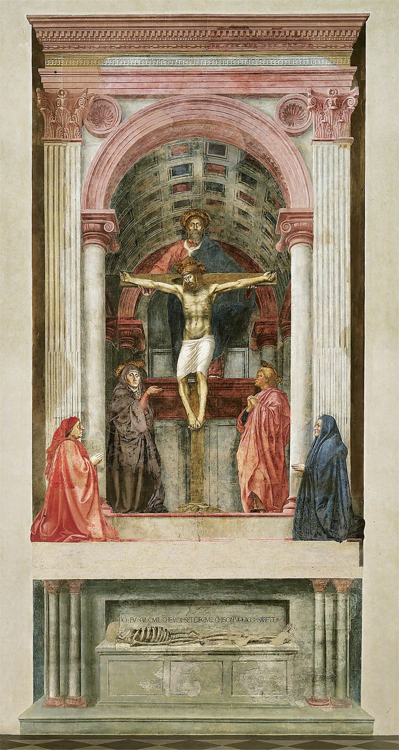 Первую линейную перспективу, полностью адаптированную к задачам художественной композиции, мы видим на фреске Томмазо Мазаччо «Троица» (1425) в церкви Санта-Мария-Новелла во Флоренции. Архитектурное обрамление создает впечатление, будто мы смотрим через арку на часовню с цилиндрическим сводом в стиле Брунеллески. Точка схода иллюзорной архитектуры, которая позволяет зрителю воспринимать двумерную поверхность как трехмерное пространство, находится на высоте ровно пять футов девять дюймов от пола, что соответствует росту идеального флорентийского зрителя-мужчины. Альберти в своем трактате о живописи (1435–1436), где подчеркивается важность математических наук как средства контроля за видимой реальностью, соотносит систему изображения с пропорциями мужского тела; флорентийская единица измерения, называемая braccio (браччо), составляла двадцать три дюйма, что соразмерно длине мужской руки. Понимание принципа измерения (способа установления пространственных отношений и пропорций, основанных на средних размерах обычных объектов, таких как водоемы, колонны и брусчатка) научило зрителя видеть и понимать пространственные отношения в новой иллюзионистической живописи.