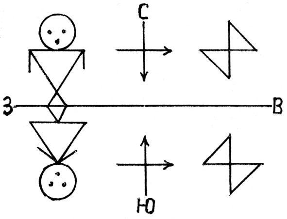 И так можно самостоятельно рассмотреть все остальные положения в пространстве. Вывод: занимая стабильное положение в пространстве, человек будет превращаться в определенное животное, не осознавая этого, т. к. одновременно будет меняться его психика.
