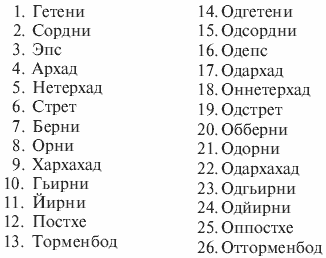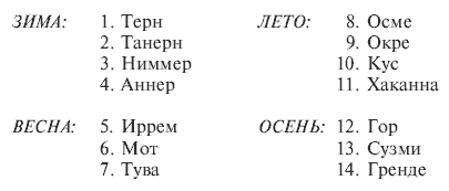 МЕСЯЦ. Период обращения гетенианской луны вокруг планеты составляет 26 гетенианских дней; луна всегда обращена к планете одной и той же стороной. В году четырнадцать месяцев, и, поскольку солнечный и лунный календари практически совпадают, поправку необходимо вносить лишь раз в двести лет; дни месяцев остаются одними и теми же, как и дни, совпадающие с фазами луны. Кархайдские названия месяцев: