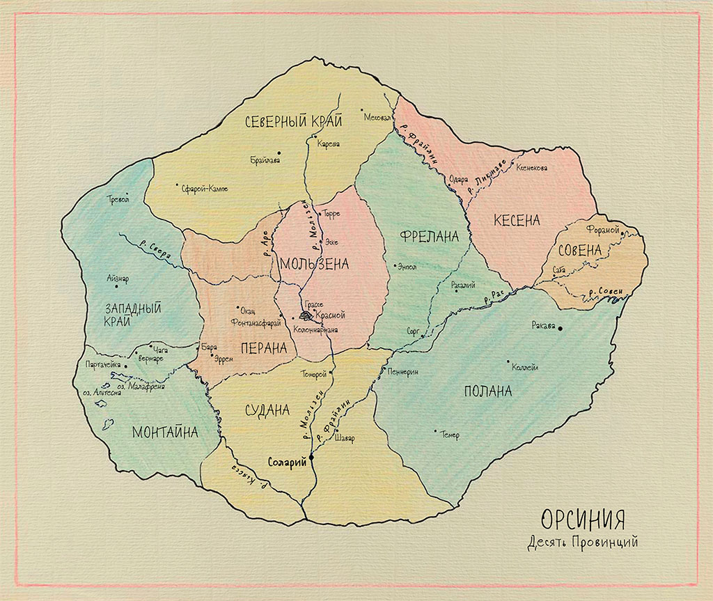 Я начинаю чувствовать, что подбираюсь ближе. Начинаю слышать названия. Орсения – на латыни, на английском – Орсиния. Вижу реку Мользен, бегущую по открытой солнечной местности к старой столице, Красною (красный – славянское «красивый). Красной стоит на трех холмах: дворец, университет, собор. Собор Святой Феодоры, вопиюще несвятой святой, имя моей матери… Начинаю осваиваться, чувствовать себя как дома. Орсения, матрия мия, моя родина. Я могу здесь жить и узнавать, кто здесь еще живет и что они делают. Могу рассказывать о них истории.