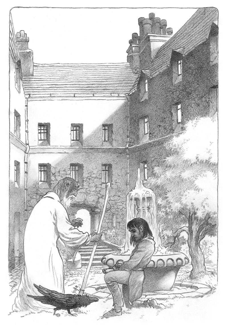 Над двориком ясно сияло открытое небо, по краям дворик был выложен мраморными плитами, а на маленькой зеленой лужайке, под юными деревцами, в солнечном свете взлетала ввысь струйка фонтана. Здесь Геду пришлось некоторое время подождать в одиночестве. Он стоял неподвижно, и сердце его неспокойно билось: он как бы ощущал чье-то невидимое присутствие, воздействие неких неведомых сил и все глубже осознавал, что дворец этот построен не только из могучих каменных глыб, но и скреплен волшебством, куда более прочным, чем камень. Гед находился сейчас в самом сердце этого Дома Мудрецов, хотя прямо над ним было открытое небо. Вдруг он почувствовал, что рядом с ним стоит какой-то человек: незнакомец, одетый в белое, наблюдал за ним сквозь падающие струи фонтана.