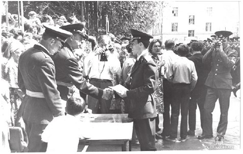 В пятницу 25 июля 1975 года состоялся долгожданный выпуск из родного училища. Приехало много гостей, родственников, представителей средств массовой информации. Нас построили по росту во взводные колонны. Училищный оркестр играет встречный марш, начальник училища генерал майор М. А. Гущо принимает доклад от своего заместителя, начальник училища при-ветсвует выпускников, следует команда «Под знамя – смирно, равнение направо!», и знаменная группа проходит перед строем и встает во главе строя. Затем начинается торжество, начальник училища произносит вступительное слово, затем зачитывается приказ Министра обороны СССР о присвоении первичного воинского звания лейтенант выпускникам училища.