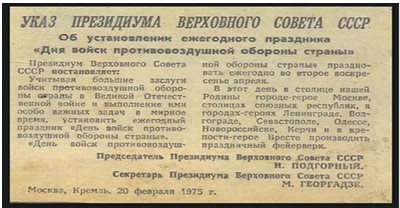 С 1971 по 1974 год профессиональным праздником для нас был День ракетных войск и артиллерии, отмечаемый 19 ноября. Для курсантов и постоянного состава училища этот день был выходным, в столовой нас ждал праздничный обед. С 1975 года был установлен День войск противовоздушной обороны, который отмечается ежегодно во второе воскресенье апреля. Этот день всегда отмечен самыми яркими воспоминаниями о службе, но все‐таки день выпуска остался саамы важным событием для нас.