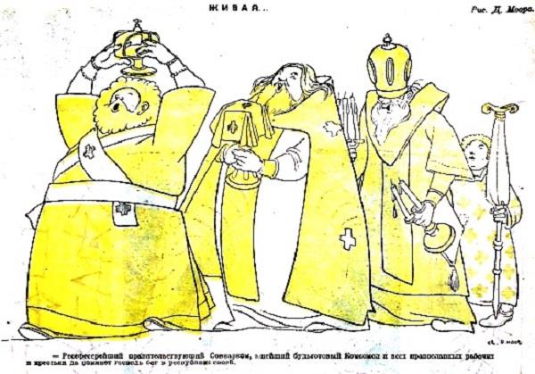 Поначалу власти отнеслись к ним не очень серьезно. Все-таки большевики были убежденными атеистами, возникновение нового течения в РПЦ считали внутренними разборками попов, а самих обновленцев – прохиндеями, пытающимися подмазаться к новой власти. Потому всячески их высмеивали, как на заглавной карикатуре, или вот на этой, появившейся в "Крокодиле" месяц спустя: