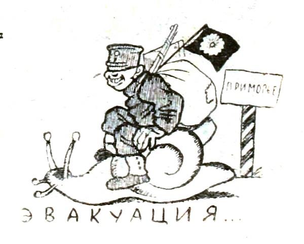 После этого появилась декларация командующего японскими экспедиционными войсками генерала Тачибани об эвакуации японских войск из Приморья. Первый период эвакуации был назначен на 7 сентября в 6 часов утра. Но потом все вновь затормозилось – в полном соответствии с карикатурой.