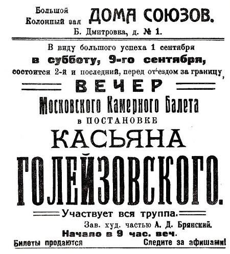 Касьян Ярославич Голейзовский родился в семье артистов Большого театра и в 8 лет был отдан в Московское хореографическое училище Большого театра. С 1909 по 1918 год – солист сначала Мариинского, затем Большого театра. В отличие от других танцовщиков – очень много учился причем в самых разных областях. Выучил английский, французский, польский и персидский языки. У профессора Д. С. Крейна учился музыке, освоил скрипку и фортепиано. Много занимался рисованием, к которому имел большой талант – учился в школе живописи М. В. Леблана и в скульптурной мастерской В. М. Попова.