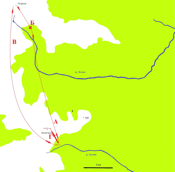 Однако, переход по Ауспии показал трудность перемещения по лесу, и тем более, неизвестно, какая снежная обстановка за перевалом. Поэтому группа (возможно после споров и обсуждений) пришла к выводу, что торопиться не надо и надо провести разведку. А для этого надо только лишь подняться на перевал и остановиться там. То есть реально получился короткий маршрут – «Г».