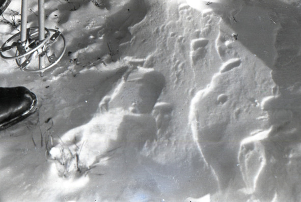На каменных грядах следы исчезли, а ниже камней они появились вновь, а затем потерялись. Следы были очень хорошо различимы. В отдельных следах было видно, что человек шел или босой или в одном хлопчатобумажном носке, т.к. отпечатались пальцы стопы.