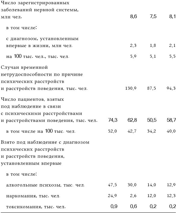 Сходную картину показывают и данные о динамике заболеваний населения психическими расстройствами и расстройствами поведения, связанными с употреблением психоактивных веществ. Исходя из численности пациентов, взятых под наблюдение с диагнозом, установленным впервые в жизни, число заболеваний алкоголизмом и алкогольными психозами в 2010–2020 гг. уменьшилось почти в 3 раза (со 153,9 тыс. до 54,9 тыс.), но в 2020–2022 гг. это снижение остановилось. Аналогично численность пациентов с диагнозом наркомания в 2010–2020 гг. уменьшилась в 2 раза (с 24,9 тыс. до 12,0 тыс.), а в 2020–2022 гг. это уменьшение тоже остановилось. Наконец, зарегистрированное число больных токсикоманией в 2010–2020 гг. сократилось почти в 4 раза (с 0,9 тыс. до 0,24 тыс.), а в 2020–2022 гг. сокращение и этого показателя прекратилось. По всем трем показателям мы видим одинаковый тренд [Здравоохранение в России, 2023, с. 48]. Таким образом, по всем основным параметрам тенденция к снижению заболеваемости психическими расстройствами сменилась их ростом или в лучшем случае стабилизацией.