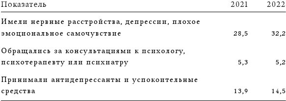 Итак, в 2022 г. треть россиян испытывали в течение года нервные расстройства, депрессии или плохое эмоциональное самочувствие. У каждого третьего психологическое состояние за год ухудшилось. Каждый двадцатый респондент обращался к психологу или психиатру, а каждый седьмой принимал антидепрессанты или успокоительные средства.