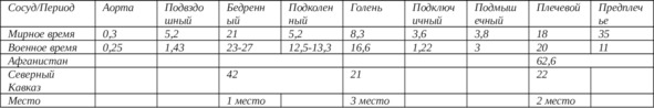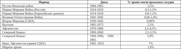 Вывод в мирное время повреждения магистральных сосудов наблюдаются реже и в абсолютном и относительном отношении. Реально ранения магистральных сосудов встречаются у 6—8% раненных, но лишь 2—3% из них удаётся живыми эвакуировать с поля боя. В. Волколаков, С. Н. Тхор (1979); А. А. Шалимов, Н. Ф. Дрюк, И. И. Сухарев (1979, 1984); М. Д. Князев, А. В. Алексеев (1980); Н. А. Шор (1984); D. Linder, J. Vollmar (1965) – приводят убедительные данные о значительном росте сосудистого травматизма в мирное время, который в общей структуре травматизма составляет до 2%