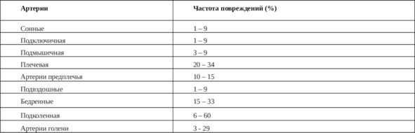 Сочетанные ранения артерий и вен 20—40%, изолированные ранения артерий 60—70%. Ранения сосудов сочетаются с переломами – 43%, с травмой нервов – 45%.