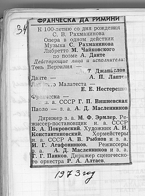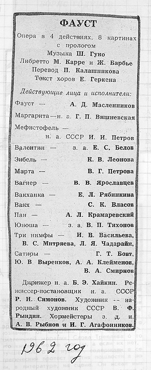 Спустя много лет я заново перелистываю альбомы о Большом театре. Фотографий Галины Вишневской там нет, но память о ней все же осталась. Две программки оперных спектаклей с ее участием: «Франческа да Римини» и «Фауст» (сама Вишневская называла «Фауст» одной из самых красивых и любимых опер). Программки помещены в разделе, посвященном народному артисту РСФСР Алексею Масленникову, многолетнему партнеру Вишневской.