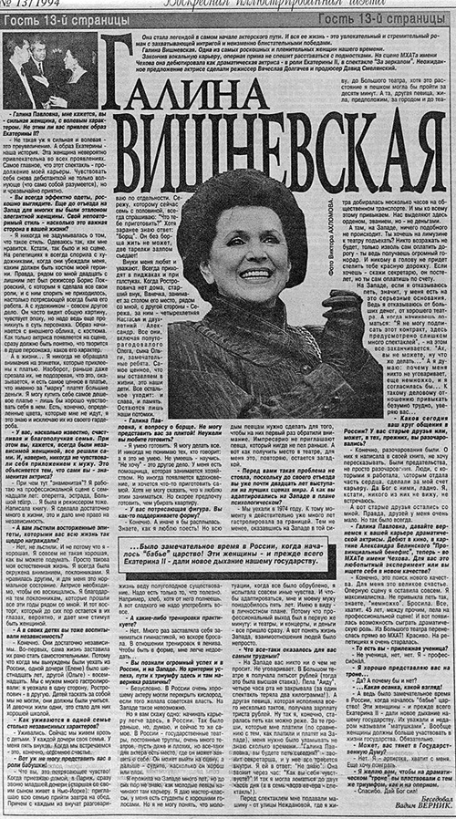 Интервью Вадима Верника с Галиной Вишневской. 1994 год. Еженедельник «Неделя».