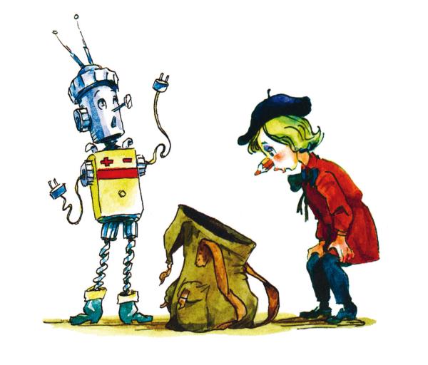 Друг Карандаша, железный человечек мастер Самоделкин, рисовать совсем не умел. Зато моментально мог смастерить всё, что угодно. Ведь у него были золотые руки.