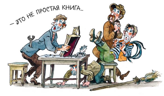 – Сначала нужно придумать, как сокровища из замка выкрасть, а потом будете мечтать! – вставая из-за стола, грозно прикрикнул сантехник Бегемотов. – Где-то тут была старая книга, которая завалялась ещё с тех времён, – роясь в шкафу, сообщил он.