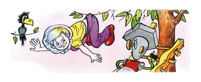 Ну как вы думаете, что делал этот Прутик? Ни за что не угадаете? Мальчик висел на дереве, зацепившись не то рубашонкой, не то штанами за ветку, и улыбался! Лицо и голову Прутика закрывал прозрачный пакет. Обыкновенный пакет, в который кладут хлеб, чтобы хлеб не высыхал.