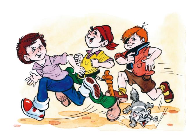 И тут на улице появились Карандаш и Самоделкин. Они увидели Прутика, замахали руками, закричали, побежали за ним: