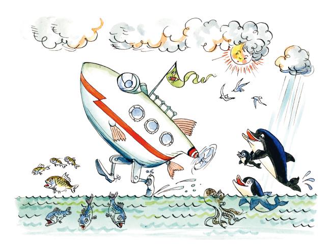 В тот же миг у «Дрындолёта» вытянулись металлические ноги, и он быстро-быстро побежал по морю, словно отталкиваясь механическими ступнями от поверхности воды. Путешественники прильнули к иллюминатору и с интересом смотрели в морскую даль. Дельфины высовывали из воды удивлённые мокрые мордочки и с любопытством разглядывали нового непонятного зверя, который появился в их владениях.